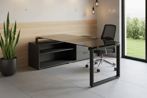 Cubierta Fabricada en Cristal Laminado de 9mm de grosor, con Base de Metal terminado pintura electrostática. Credenza baja lateral en melamina, con cajon papelero y cajon de archivo.