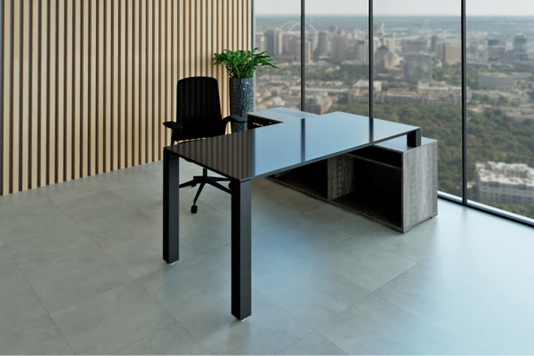 Cubierta Fabricada en Cristal de 9mm de grosor, con Base de Metal terminado pintura electrostática. Credenza baja lateral en melamina, con cajon papelero y cajon de archivo.