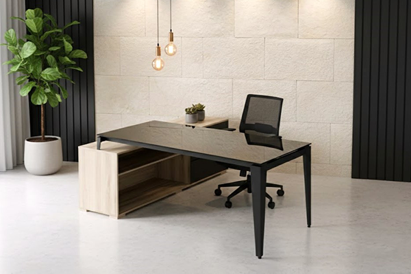 Cubierta Fabricada Cristal laminado 9mm, con Base de Metal terminado pintura electrostática. Credenza baja lateral en melamina, con cajon papelero y cajon de archivo.